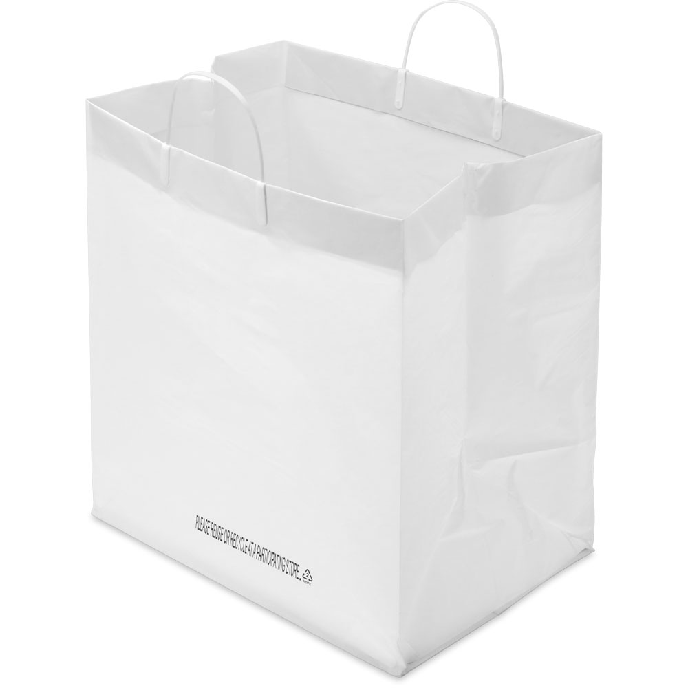 - Fold-over top is reinforced with cardboard insert before handles are attached-allows for stronger grip and is tear-resistant.