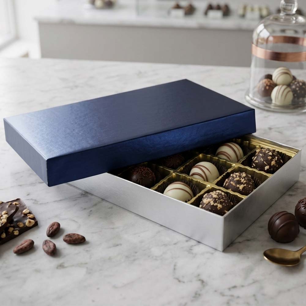 1/2 lb. Silver Silk Base with Sapphire Lid Two Part Rigid Candy Boxes - 8.125 x 5.25 x 1.125 in.