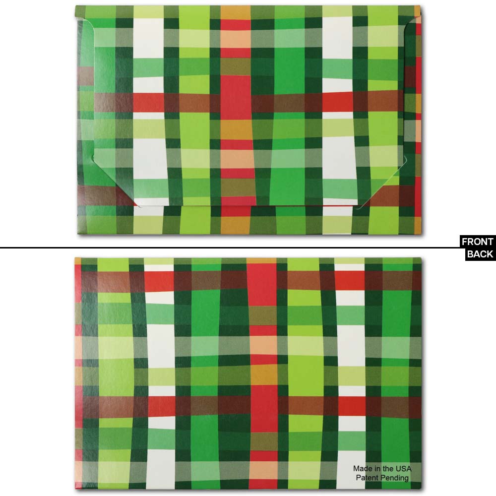 This gift card folder features a distinctive christmas plaid design that helps businesses elevate the presentation of gift cards at checkout. The glossy cardstock construction unfolds into a freestanding display that showcases the card upright while providing a writing area for a message or amount. It is a simple way to turn a gift card into a more memorable gift.