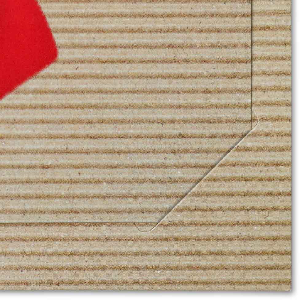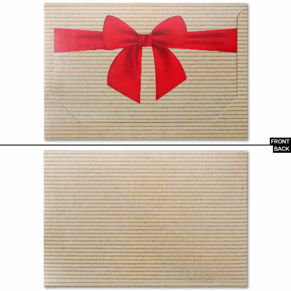 This gift card folder features a distinctive kraft with bow design that helps businesses elevate the presentation of gift cards at checkout. The glossy cardstock construction unfolds into a freestanding display that showcases the card upright while providing a writing area for a message or amount. It is a simple way to turn a gift card into a more memorable gift.