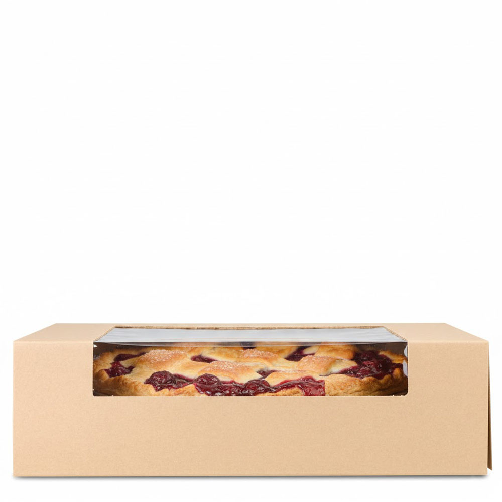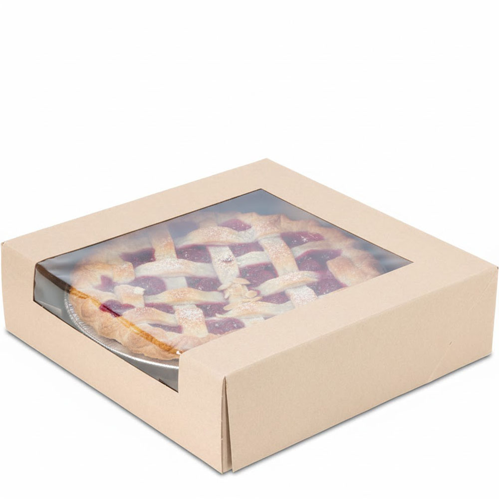 Perfect for an 8" pie, tart, quiche or cake . A 9" box best fits a 8" pie to account for crust and pie plate overflow. Semi-automatic style allows ease in assembly. Waterfall window showcase your bake goods from top and side.