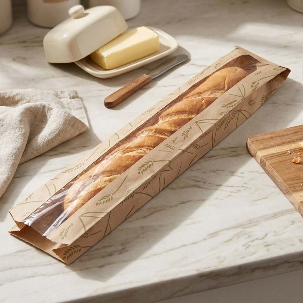 - 2-1/2" Wide Clear Windowed Panel runs the full length of the front panel of this baguette type bakery bag to show off your bread.