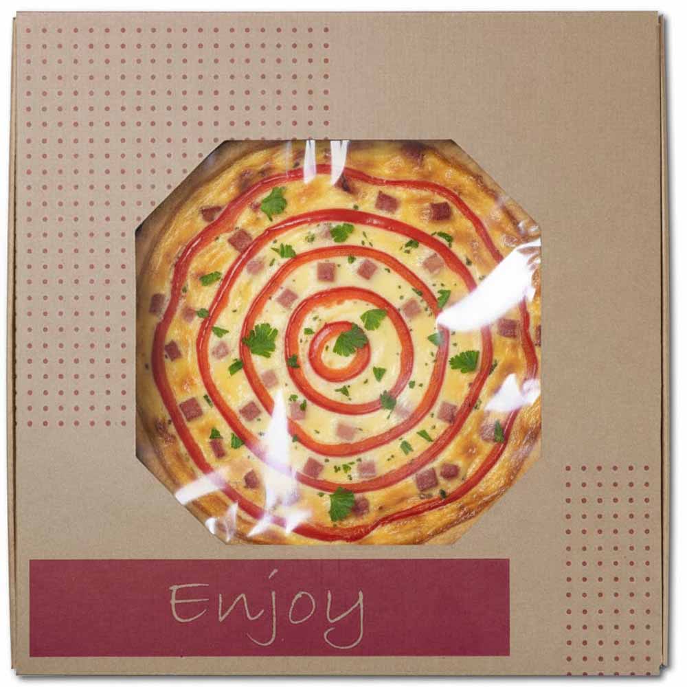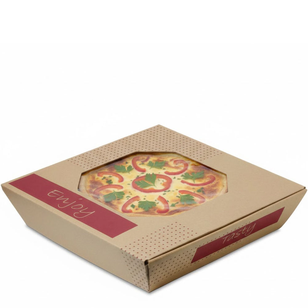 16 in. Catering Square with Window - Natural Brown Kraft with Red "Tasty", "Enjoy" Design