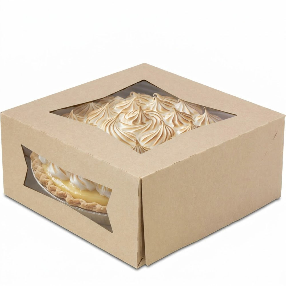 Durable food-safe bakery box in natural kraft. Size: 9 x 9 x 4 in.