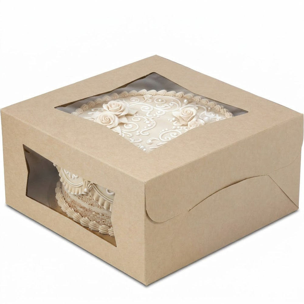 Durable food-safe bakery box in natural kraft. Size: 10 x 10 x 5 in.