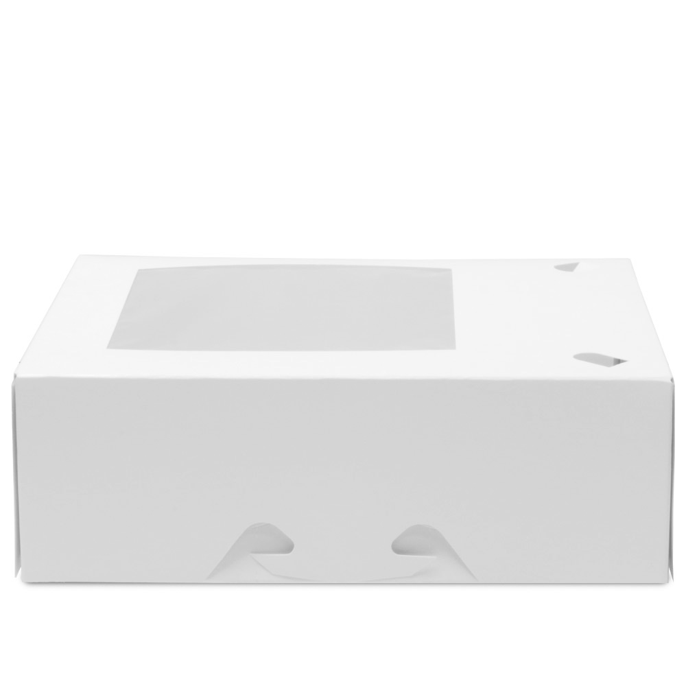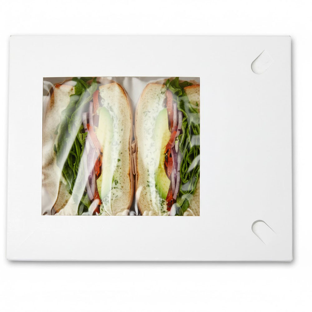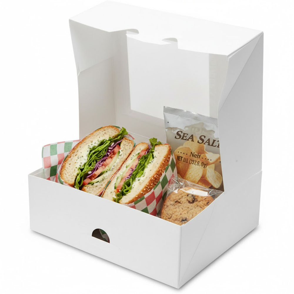 - White paperboard lunch boxes have an automatic bottom and a tuck top