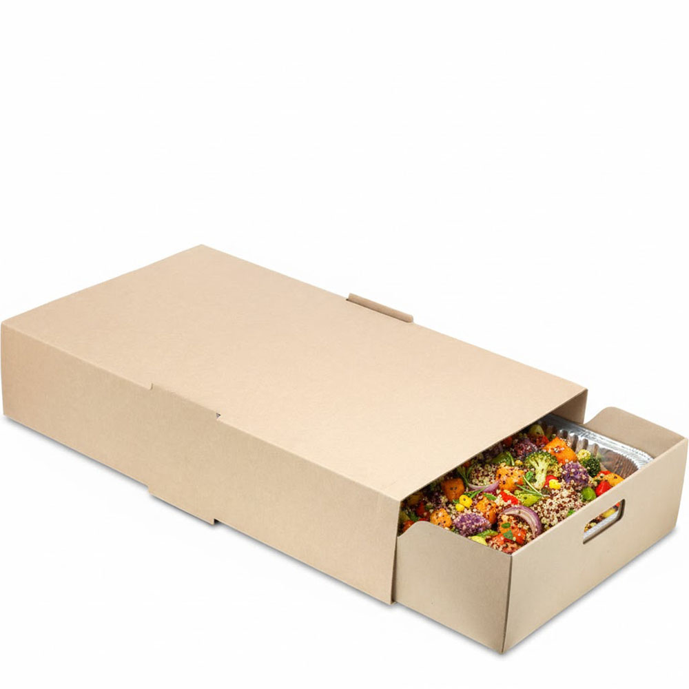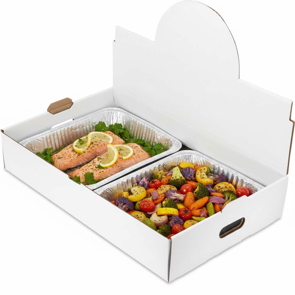 - Stackable and durable corrugated cardboard means no more worrying about aluminum trays collapsing or food being damaged